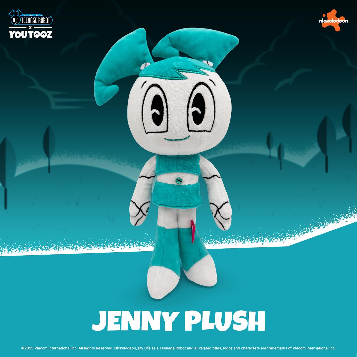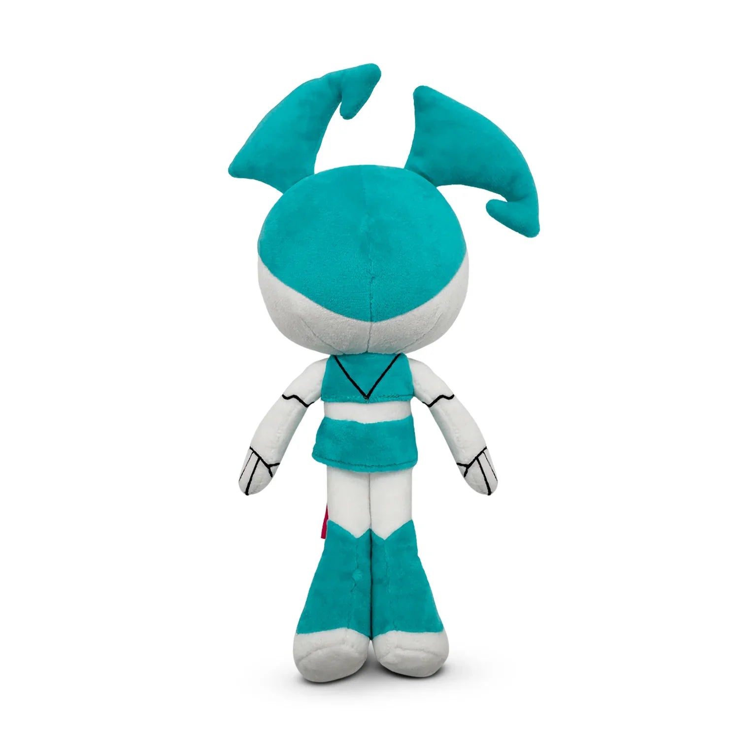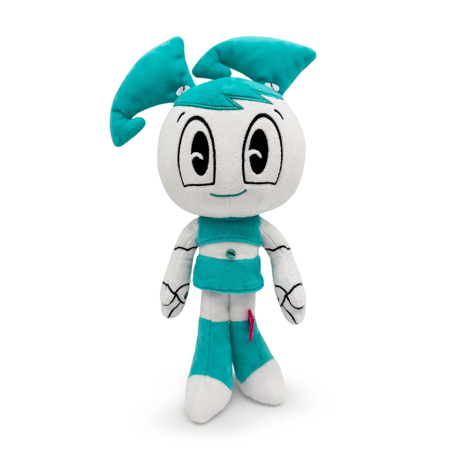 Regular Jenny: At 9 inches tall with arms at her sides, Jenny's teal and white body has given up metal and swapped it for plush material as her teal skirt and tube top match her boots and pigtails. With white legs, tummy, face and arms, a thin happy smile crosses her round face as a pair of huge eyes stare forward.