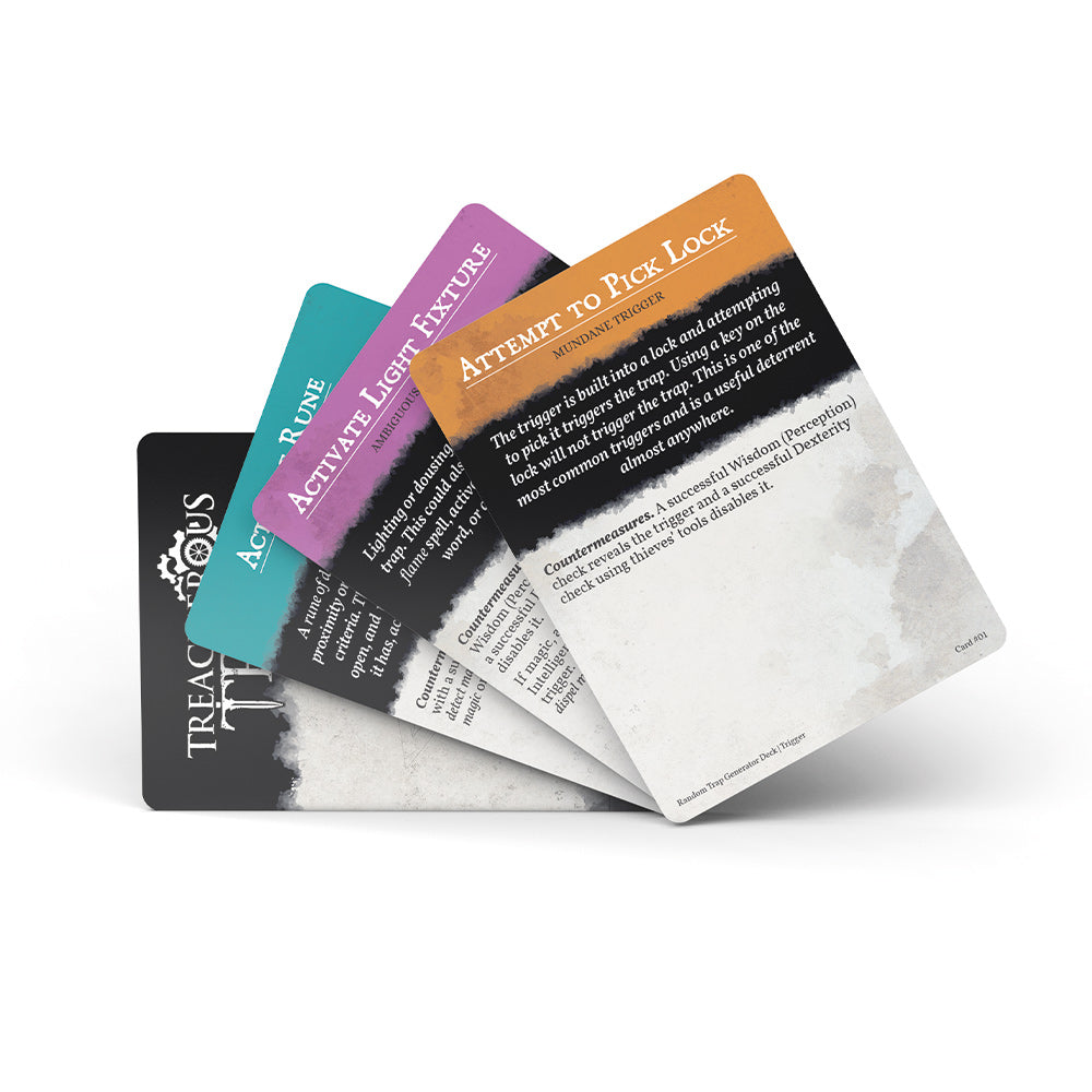 Easily generate ideas for your own traps! This 100 card deck contains 50 triggers and 50 effects. Pull one of each and create a unique trap every time, which you can flavor and adjust as you see fit.
