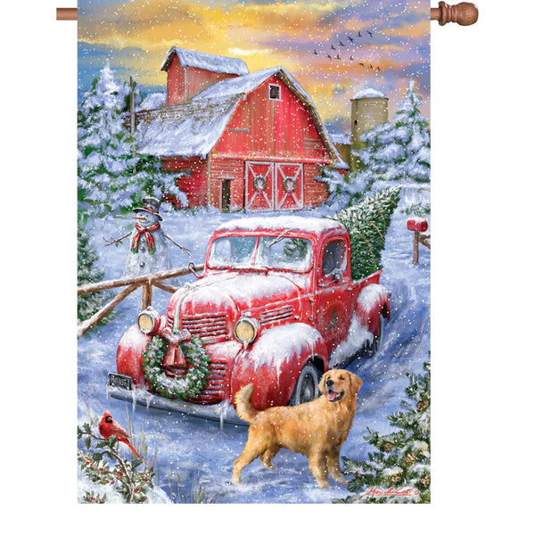 Illuminated Flags are made from durable fade resistant polyester fabric. They are sublimated with bright colors and eye-catching themes. This flag features a red barn, old-time red truck, a cute golden retreiver and a red cardinal.